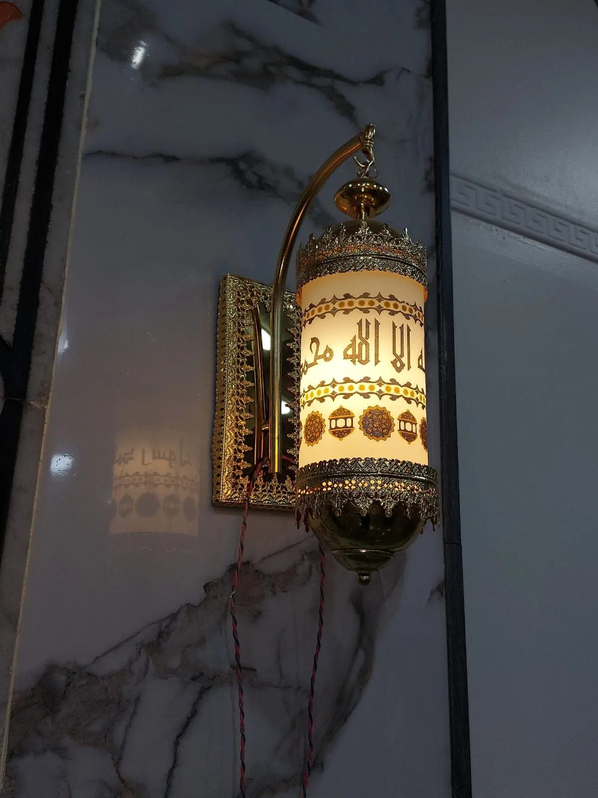 This elegant wall sconce is designed with intricate Islamic motifs on frosted glass, framed in a detailed golden structure. Its compact design and fine craftsmanship make it ideal for enhancing spiritual or decorative spaces.