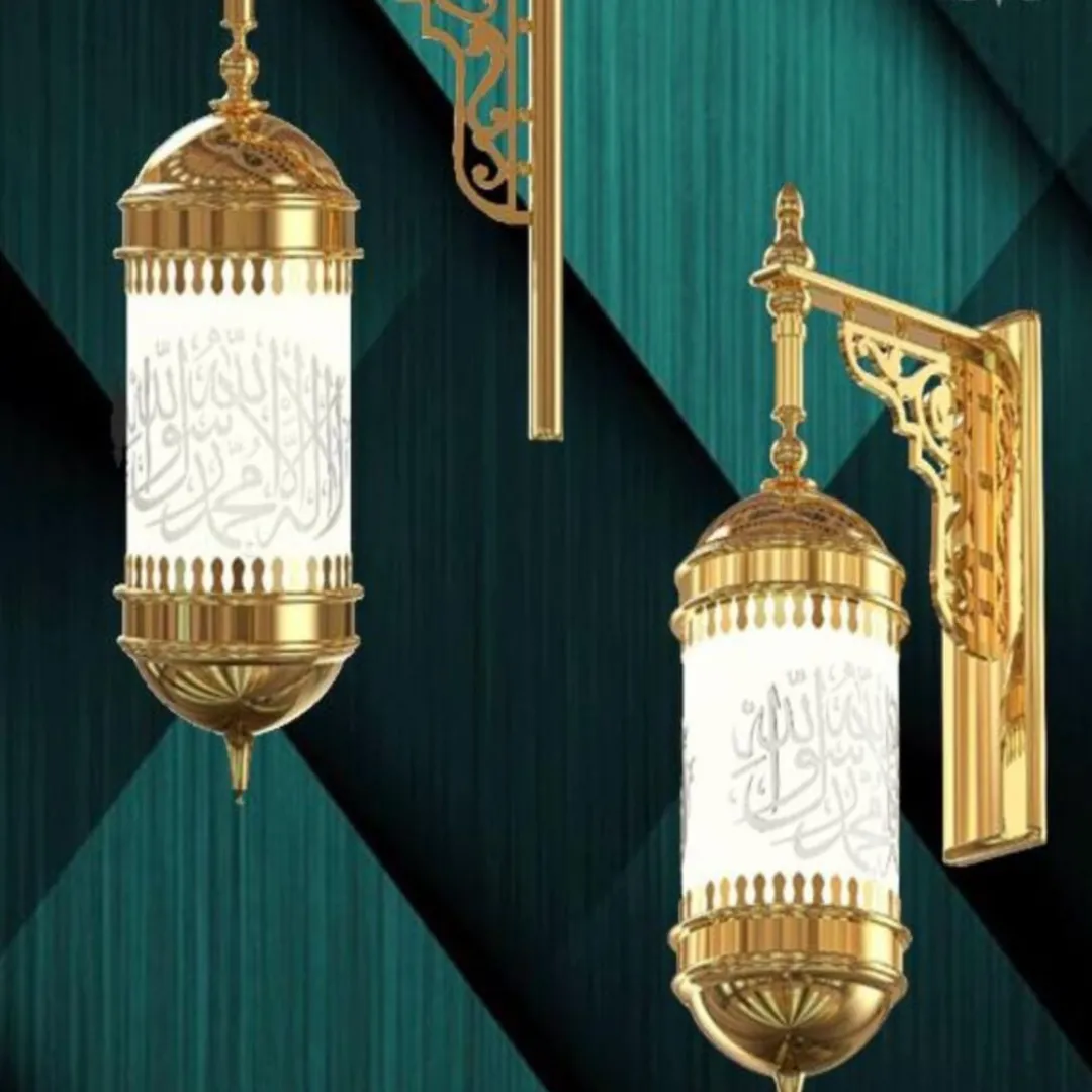 This exquisite wall lantern features a classic cylindrical shape with intricate Arabic calligraphy etched onto its frosted glass. The golden finish enhances its luxurious appeal, making it perfect for adding a spiritual and elegant touch to interiors or prayer spaces.