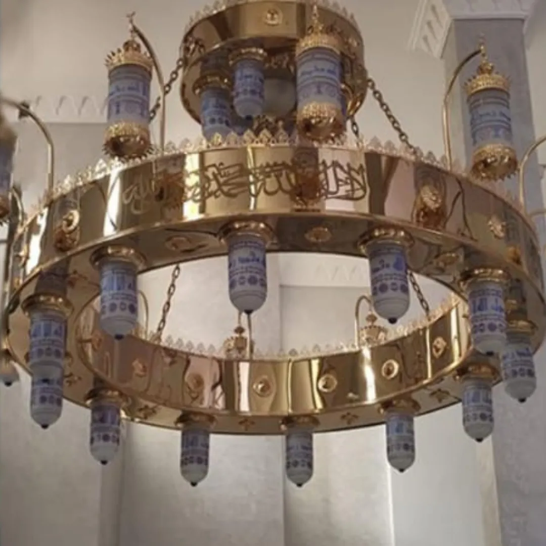 This breathtaking chandelier is designed for large spaces, with a majestic gold frame and intricate Islamic motifs. Its towering height and circular design make it a true statement piece, perfect for enhancing the ambiance of mosques or luxurious halls. The chandelier’s 33 bulbs provide a stunning, warm glow to any room.